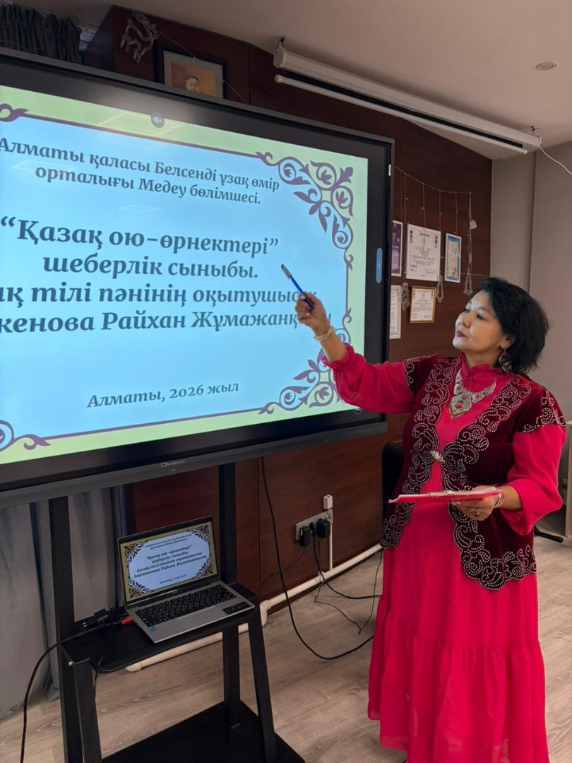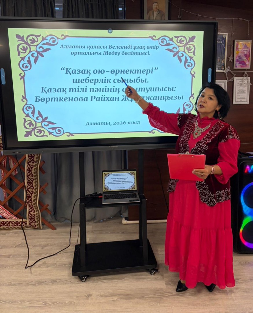 Сегодня, 15 января 2026 года, в Медеуском отделении Центра активного долголетия города Алматы состоялся открытый урок по казахскому языку на тему «Казахские орнаменты»